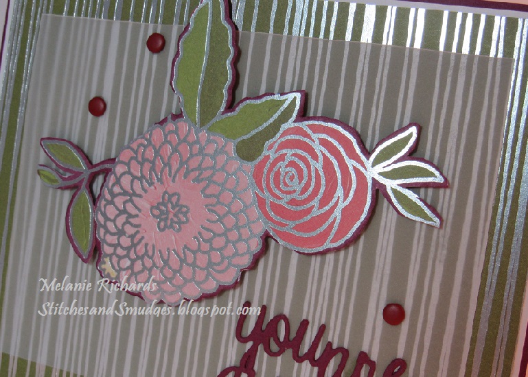 In my continuing effort to use up my hoard of patterned paper, I found this silver and green stripe with coordinating floral paper. I like the silver metallic throughout this paper. The stripe is different from the sketch but that's what sketch interpretation is all about - right?